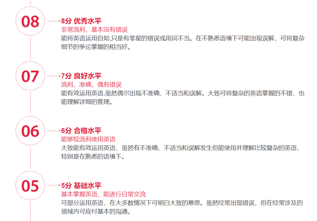 不过从中我们也可以知道6.5分介于6分-7分之间,是能有效运用英语,且出现错误频率会比6分水平要低,但还没达到能够流利准确表达的程度。