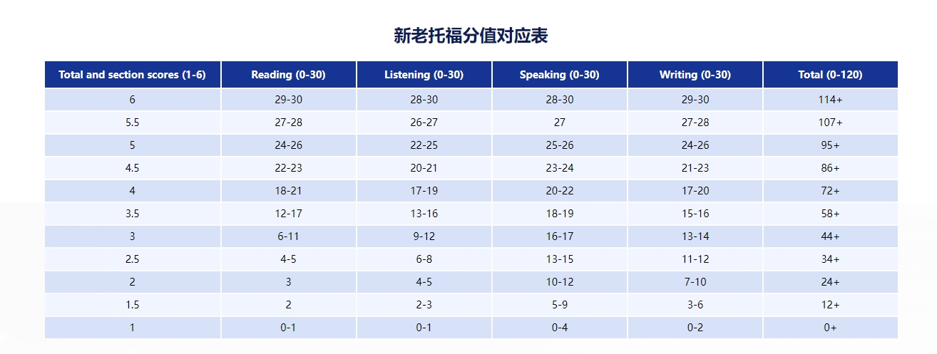为方便考生对照旧版分数要求、规划备考目标,结合ETS官方发布的对标表,整理核心分数对应关系(精准对应,供参考),过渡期内成绩单也会同步显示等效分数,无需自行换算: