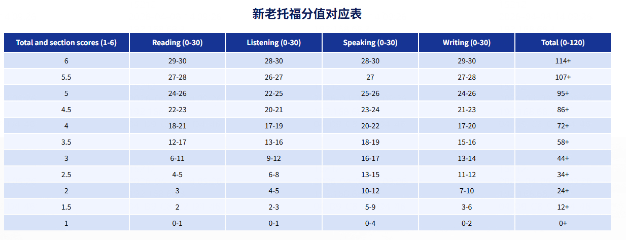 过渡说明:为方便考生和院校适应,未来两年内,托福成绩报告将同时提供1-6分制分数与0-120分制可比分数(可比分数为0-120分制等效范围的中点值),2026年1月21日前参加的托福考试成绩(有效期2年),可通过对应表解读等效分数。